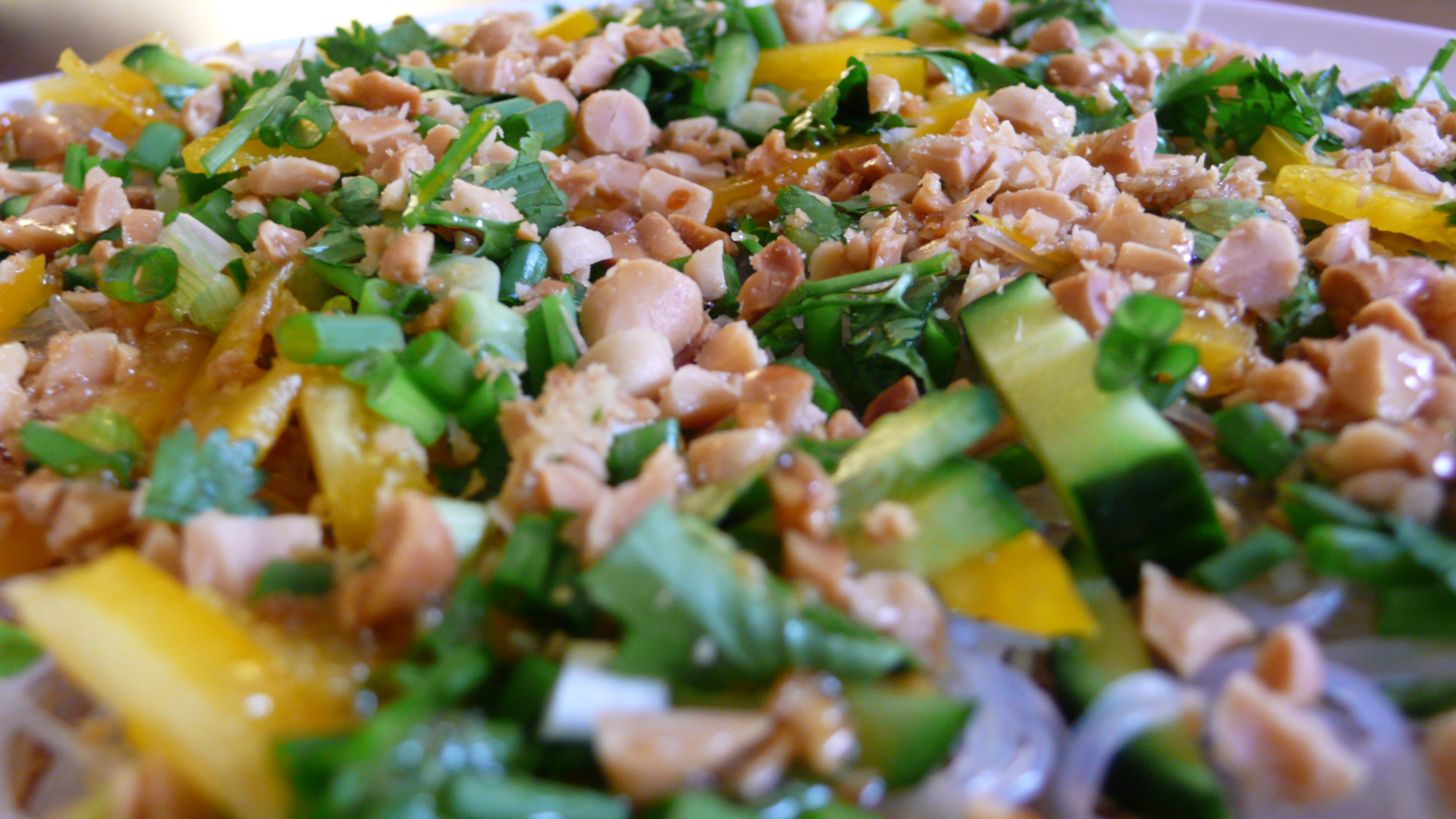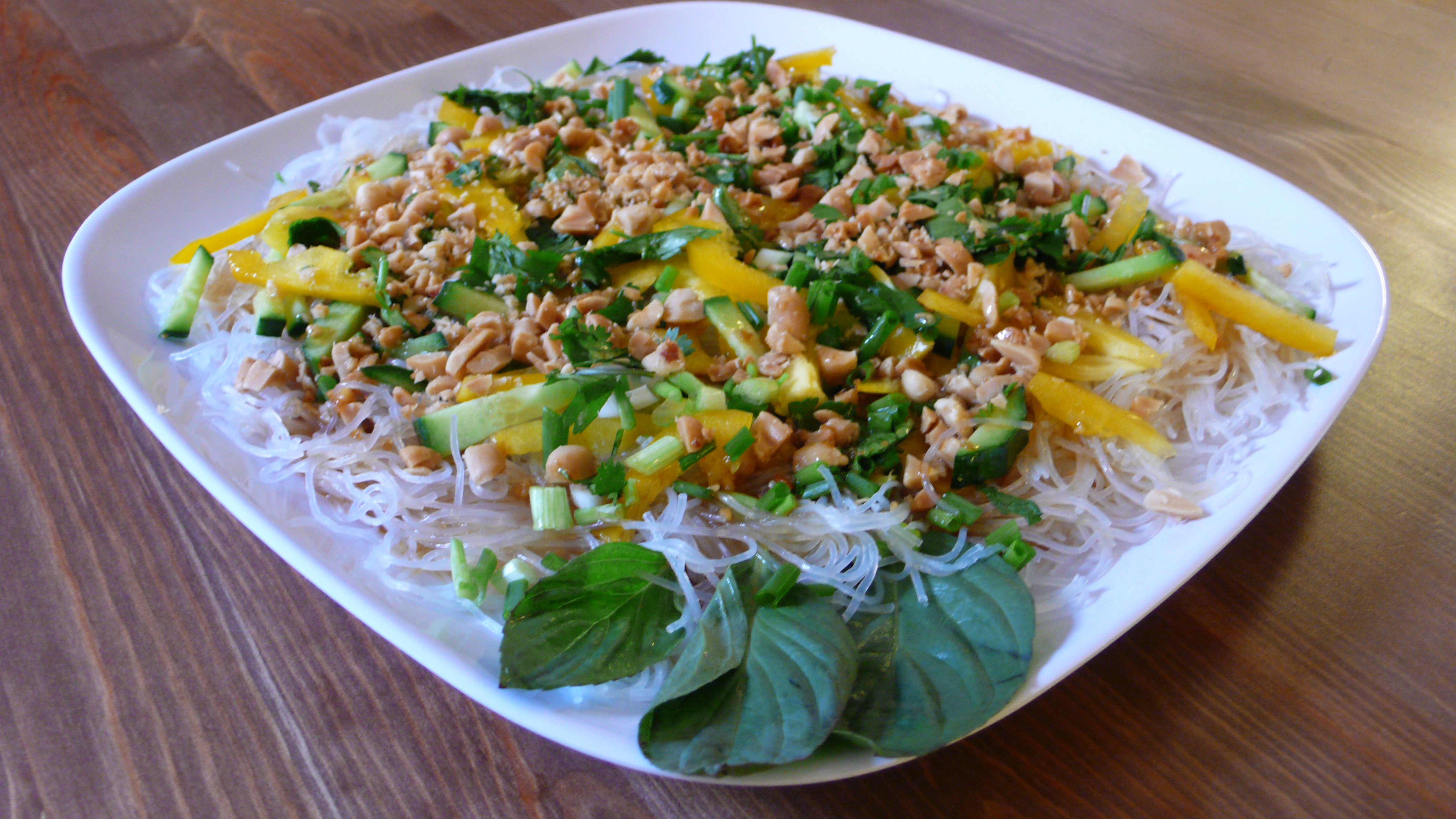 Spread the bean threads out on a serving platter. Top with all the veggies. Pour the dressing over the top and then sprinkle with peanuts.