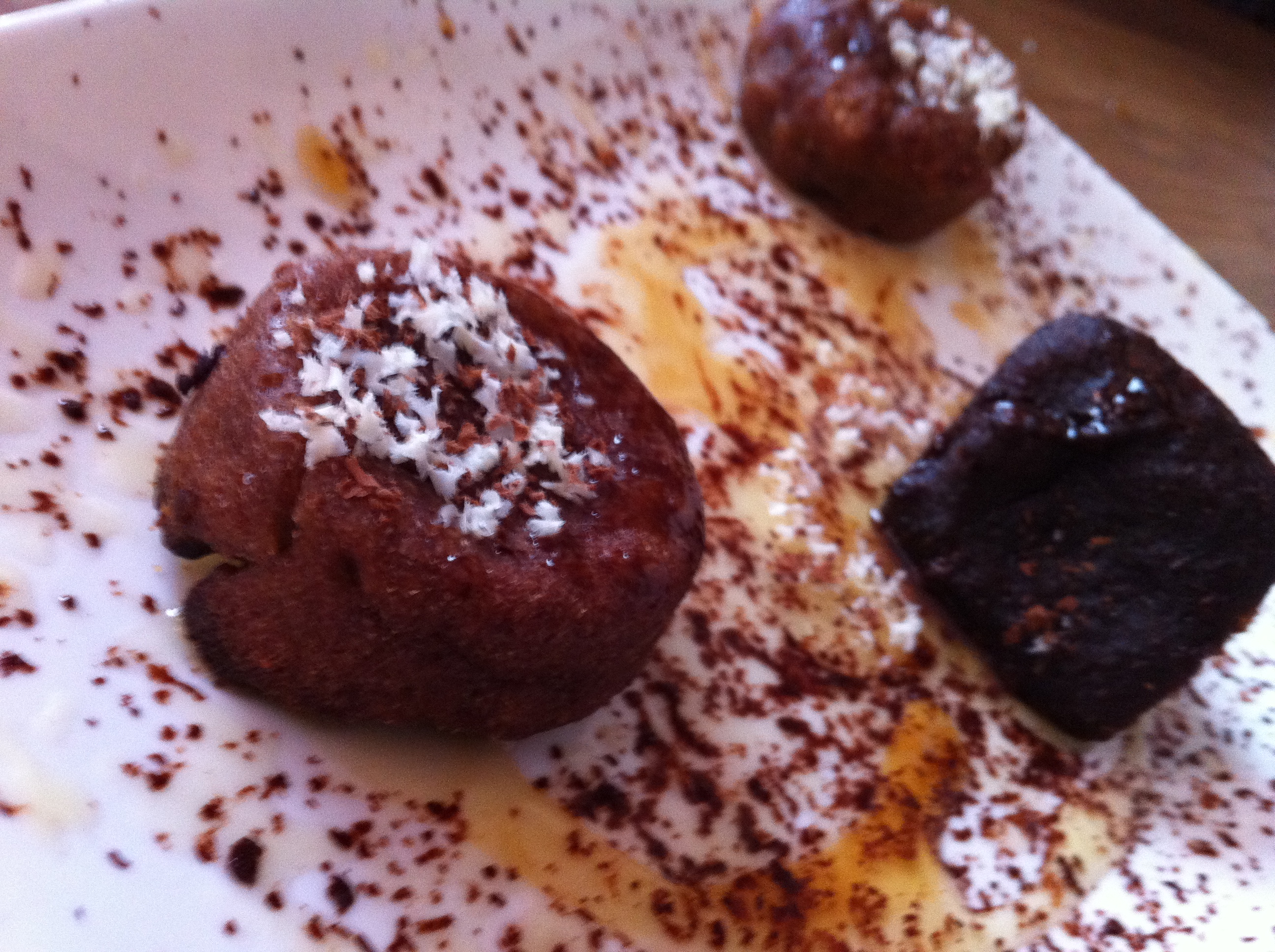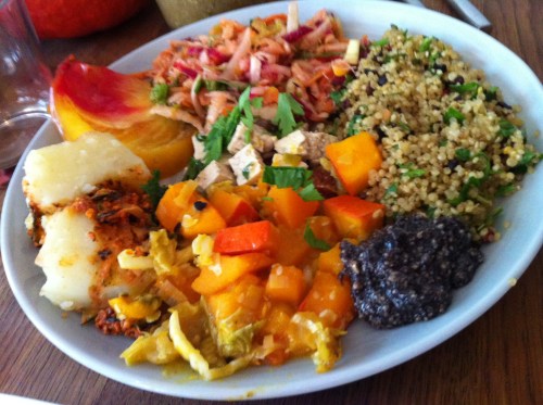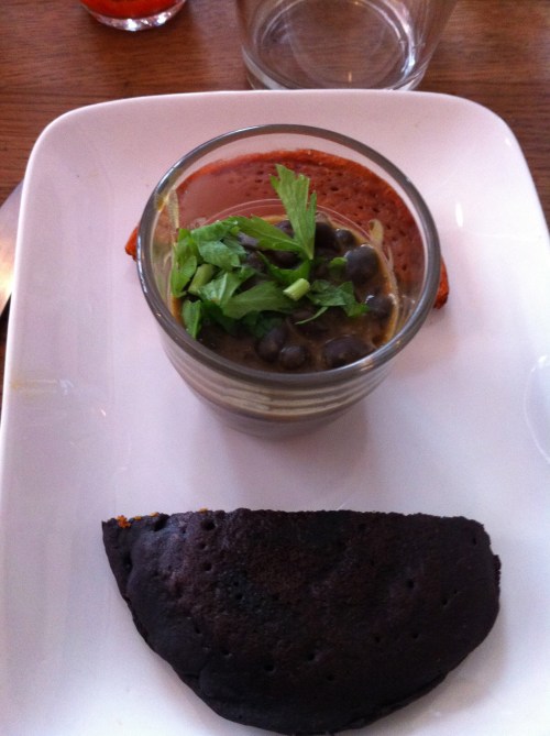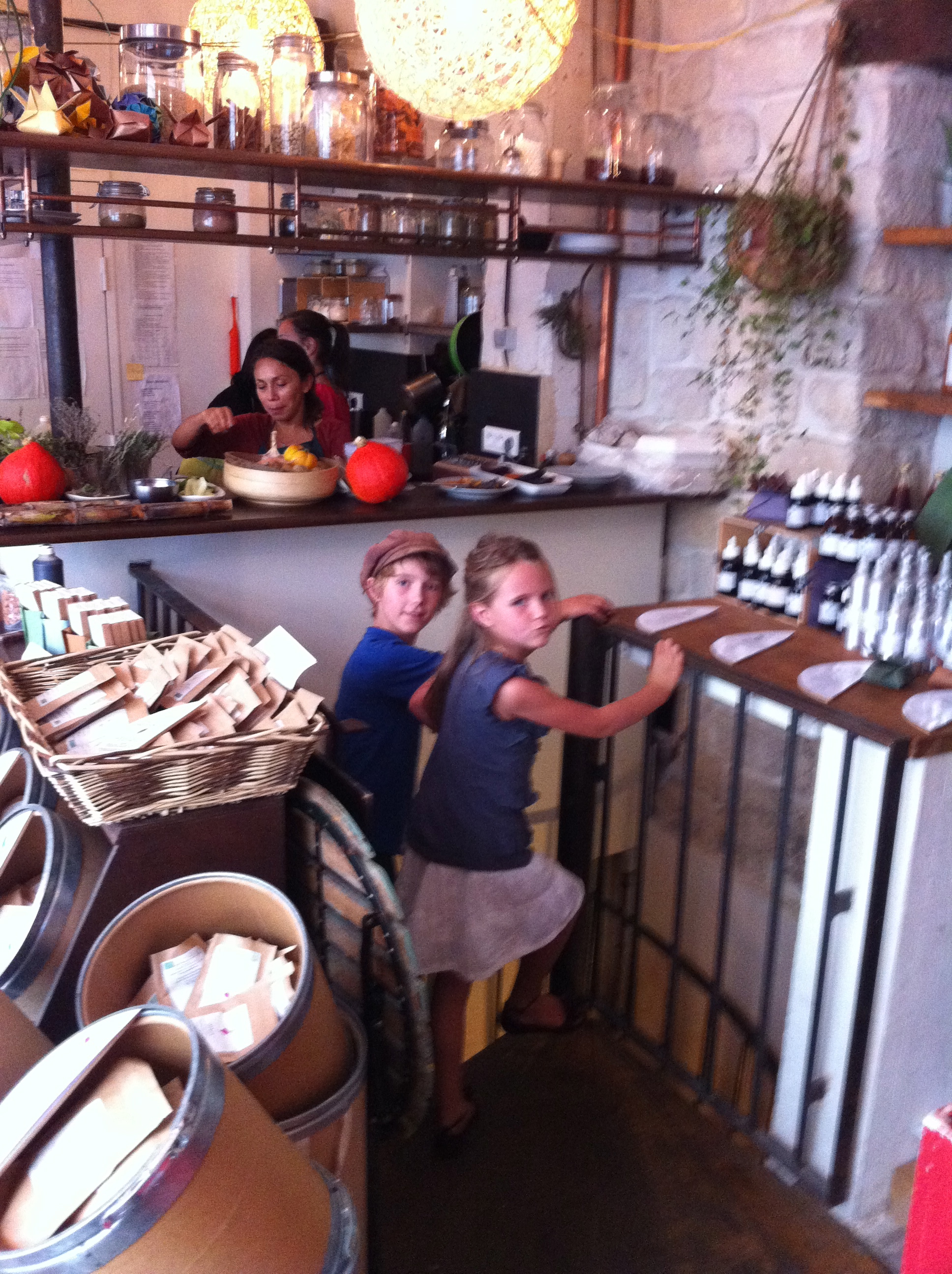 We tried some drinks and the Assiette du Jour. This was an extremely filling, energizing tour de force of South American vegetables, beautifully combined on the plate. For 12β¬ this is an unbelievable value and left me feeling nourished at every level. Which is not to say that we didnβt have desserts β we certainly did, small and delightful βmadeleines.β