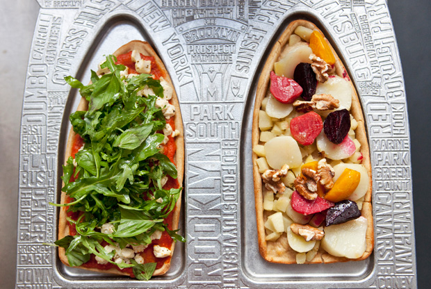 The food is really affordable because they want everyone to be able to enjoy it…not just rich people. The centerpiece is the M.O.B. – a pizza-like dish that comes in the shape of the arches of the Brooklyn Bridge (the restaurant name stands for Maimonide of Brooklyn.) They are topped with seasonal organic vegetables and sometimes fruit. They also have gluten free versions.