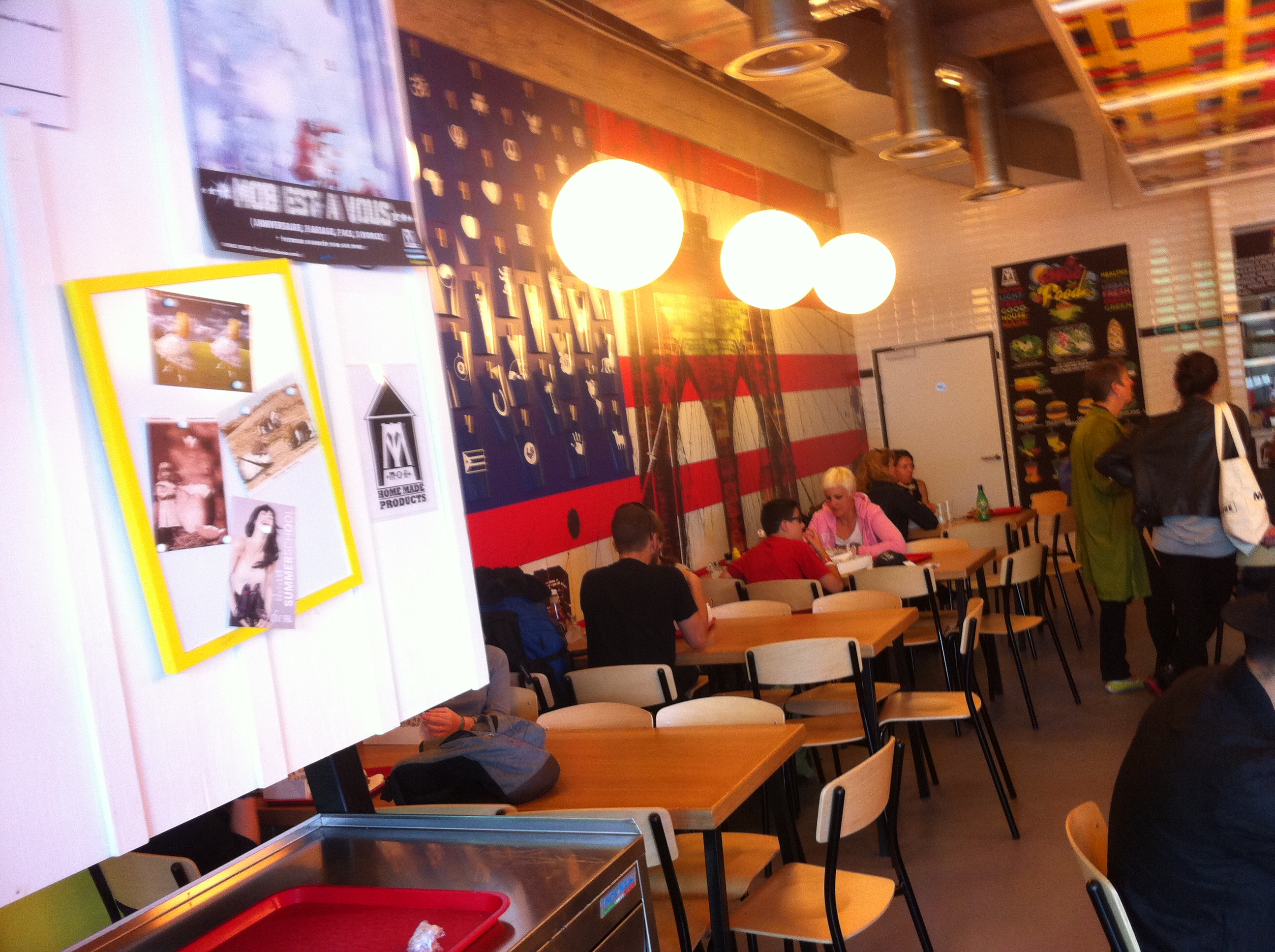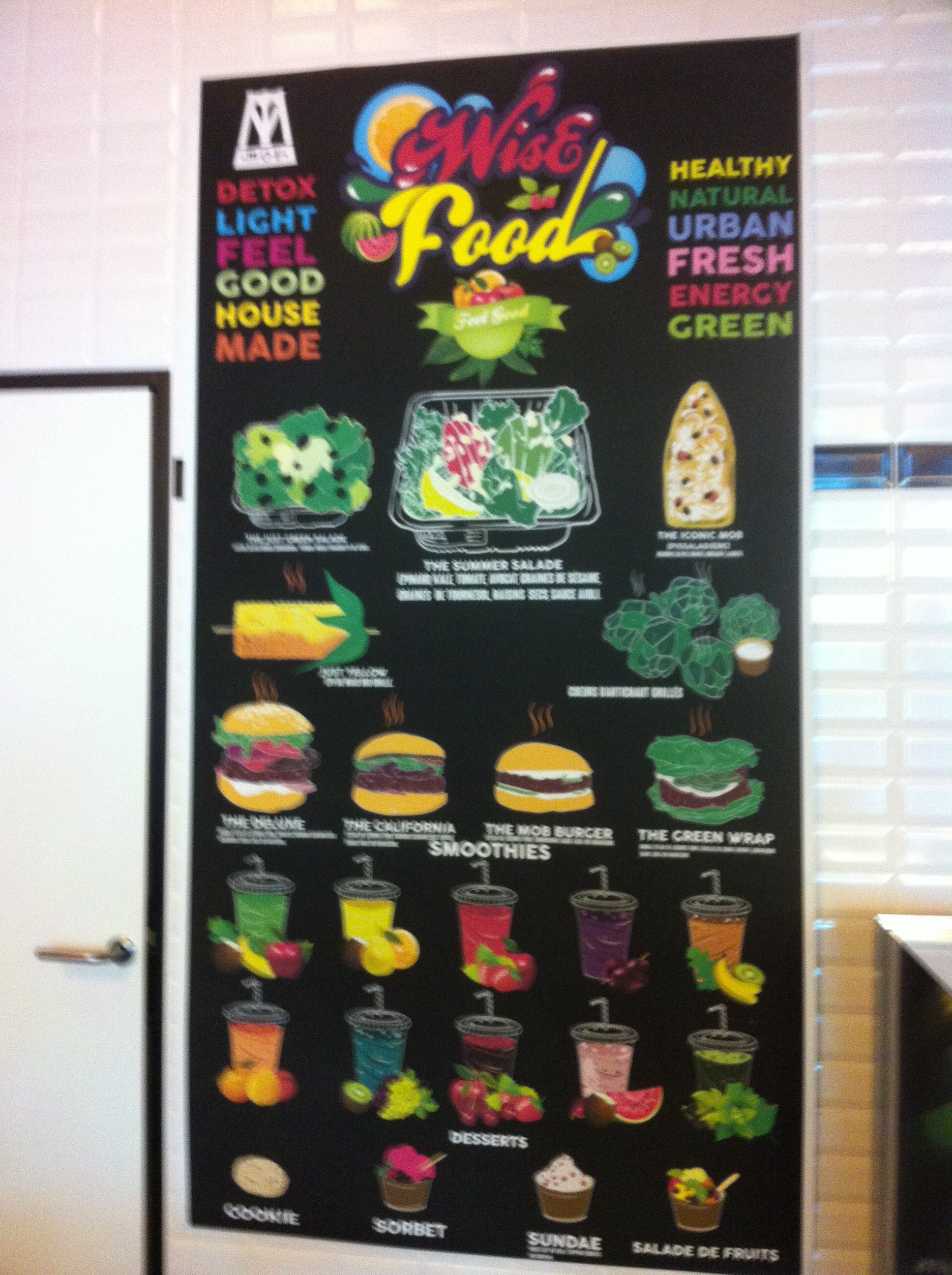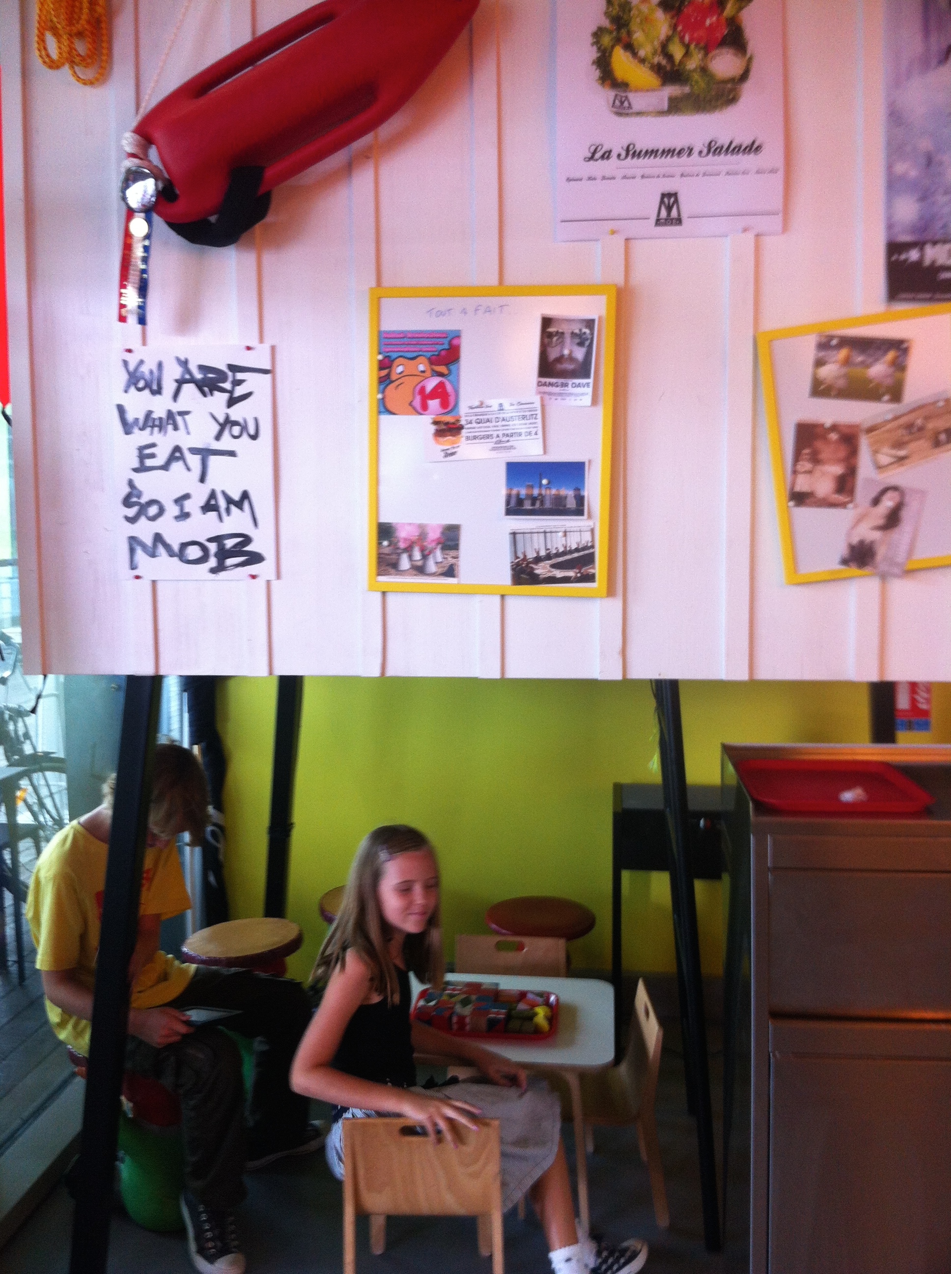 MOB’s menu is simple and limited, specializing in burgers and Pissaladières. Some of the items on the menu are very good, such as the grilled artichoke hearts and the cookies. Some are awful, like the corn on the cob. The burgers are mushy and fall apart, but they taste good and the bun and toppings are nice. They also offer smoothies, juices. Too bad that they serve all the food in disposable packaging, even for eating in. It does sort of make you feel like you are at a baseball game in the U.S.A. but it sure creates a lot of waste.