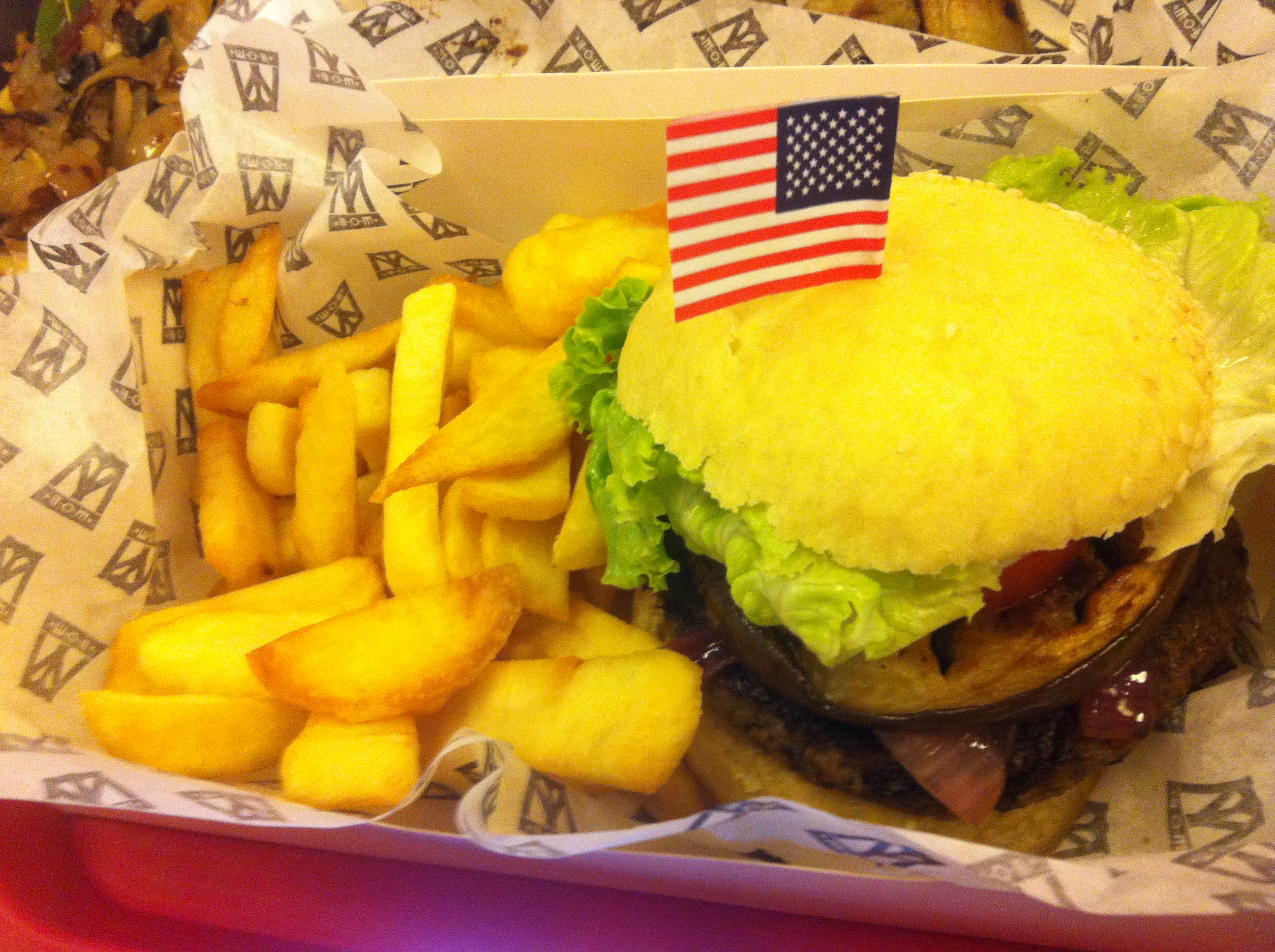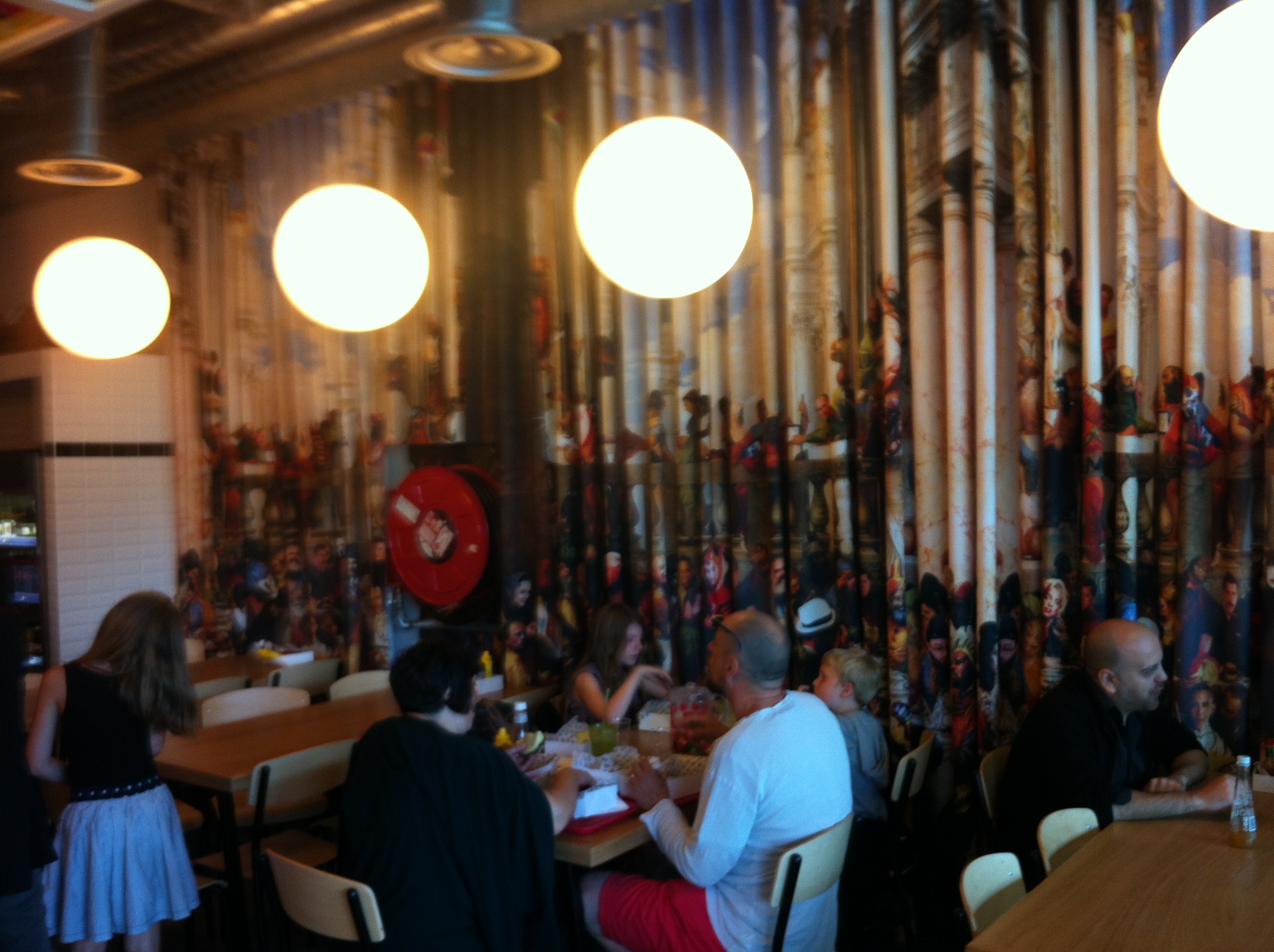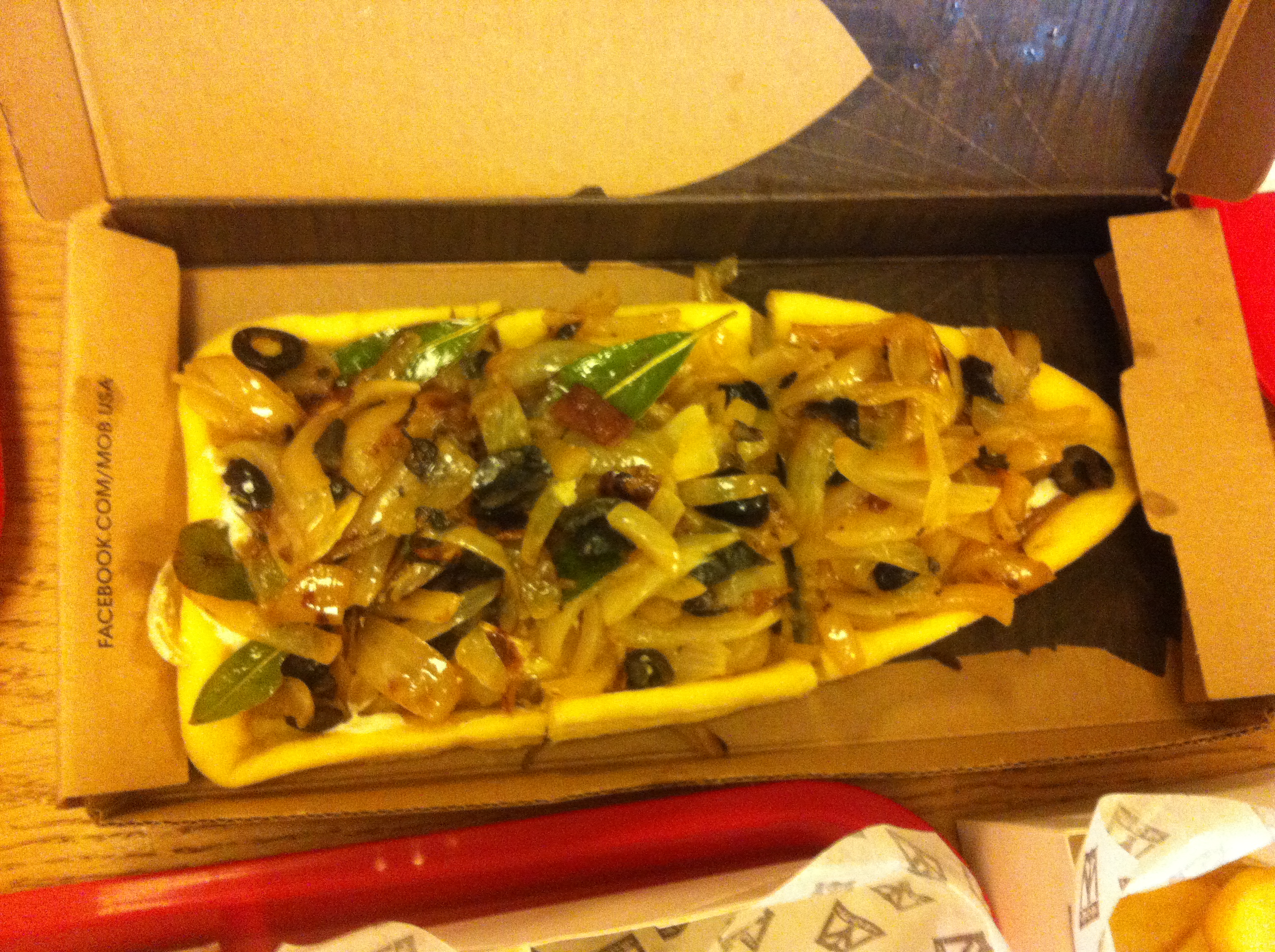 MOB’s menu is simple and limited, specializing in burgers and Pissaladières. Some of the items on the menu are very good, such as the grilled artichoke hearts and the cookies. Some are awful, like the corn on the cob. The burgers are mushy and fall apart, but they taste good and the bun and toppings are nice. They also offer smoothies, juices. Too bad that they serve all the food in disposable packaging, even for eating in. It does sort of make you feel like you are at a baseball game in the U.S.A. but it sure creates a lot of waste.