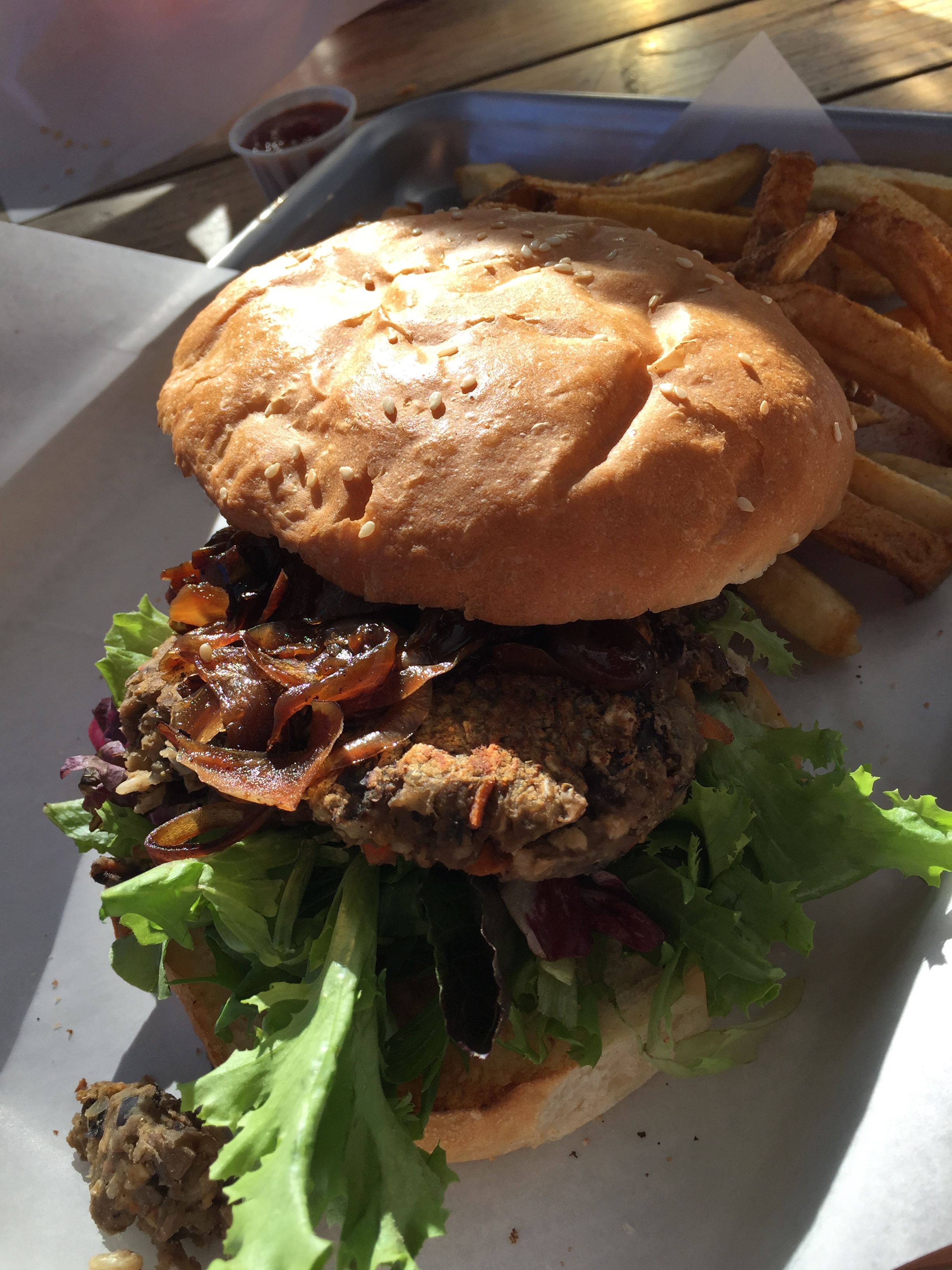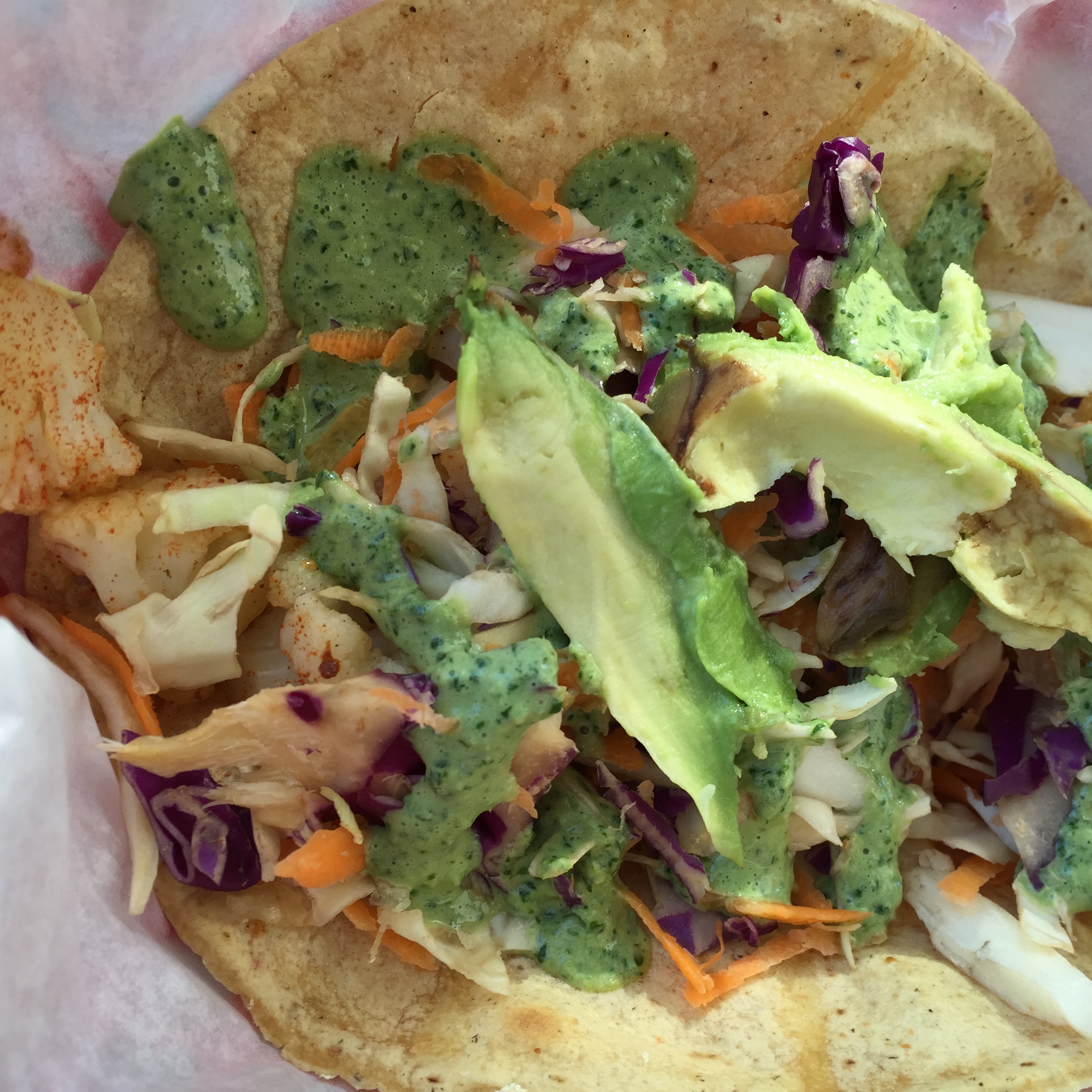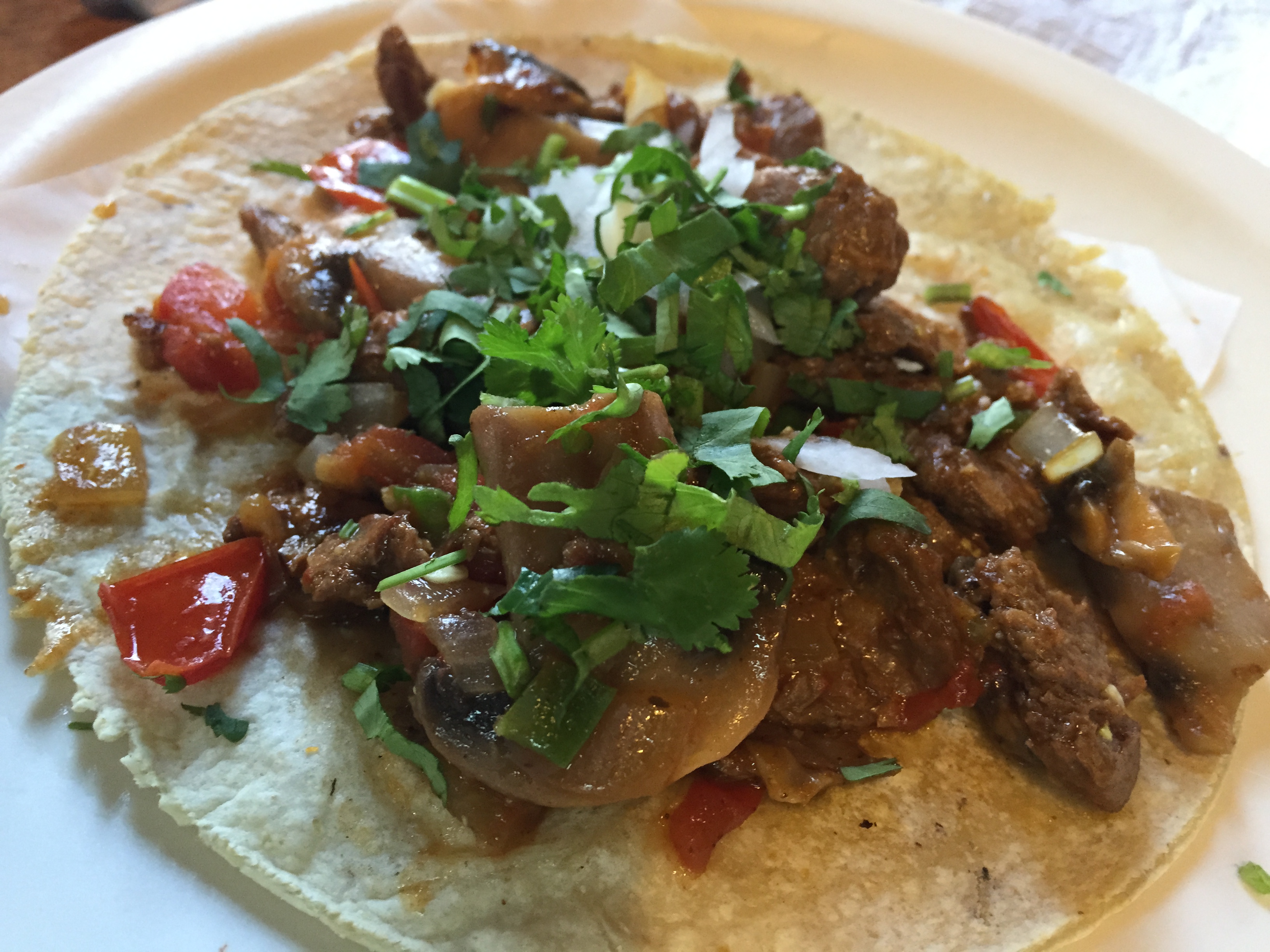 Ten minutes drive south of downtown is the Food Garden – a lively and creative food court. The main attraction for vegans there is Veggie Smalls. It’s an all veggie food stand, and in fact if you ask them to hold the cheese, everything is vegan. The menu includes tacos, hot dogs, burgers, and very good French fries and onion rings. You have to try the cauliflower tacos – delicious! This is an excellent veg fast food place, with nice outdoor seating in a stylish, modern, comfortable setting. They also have a great range of local craft beers and the people there are very friendly.